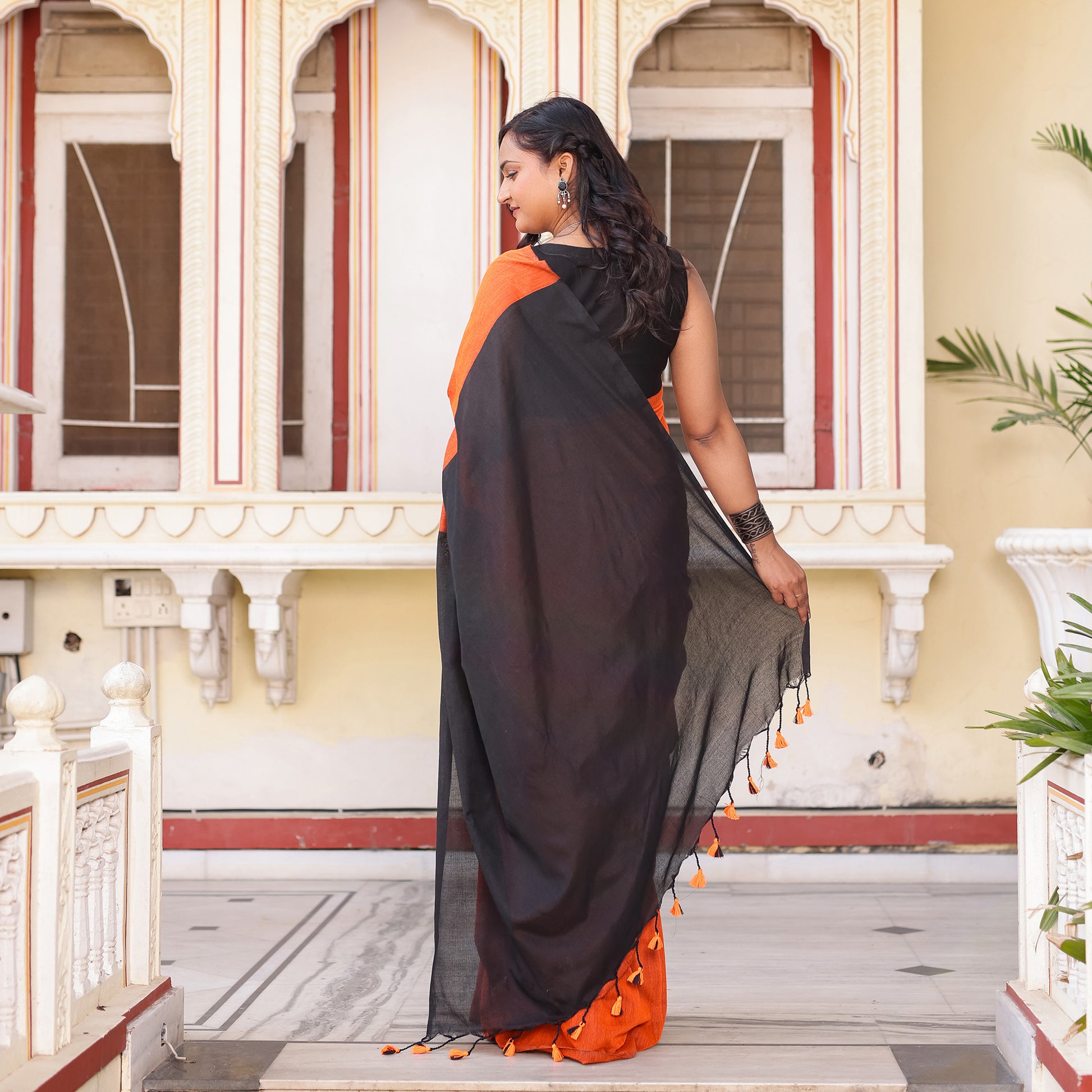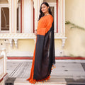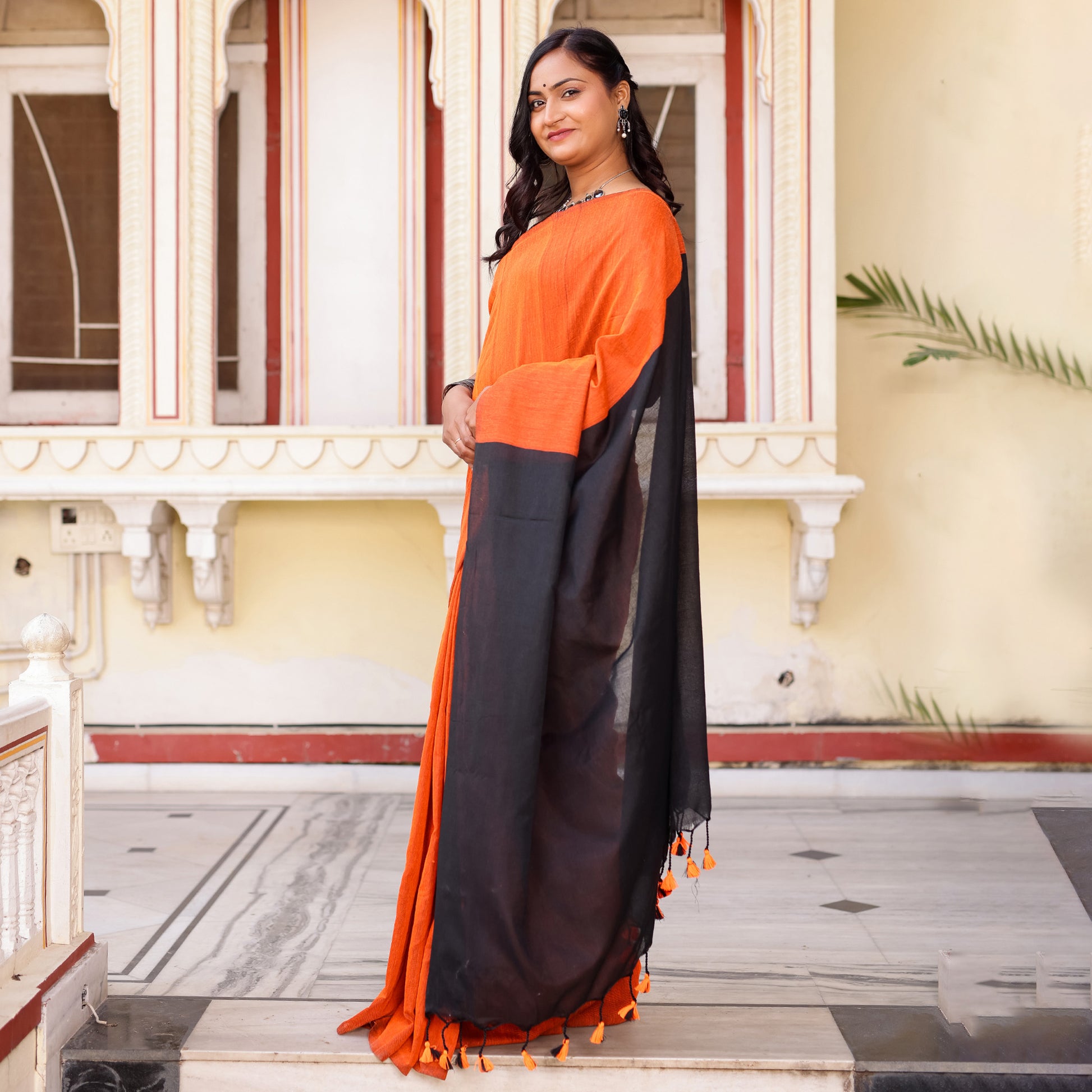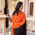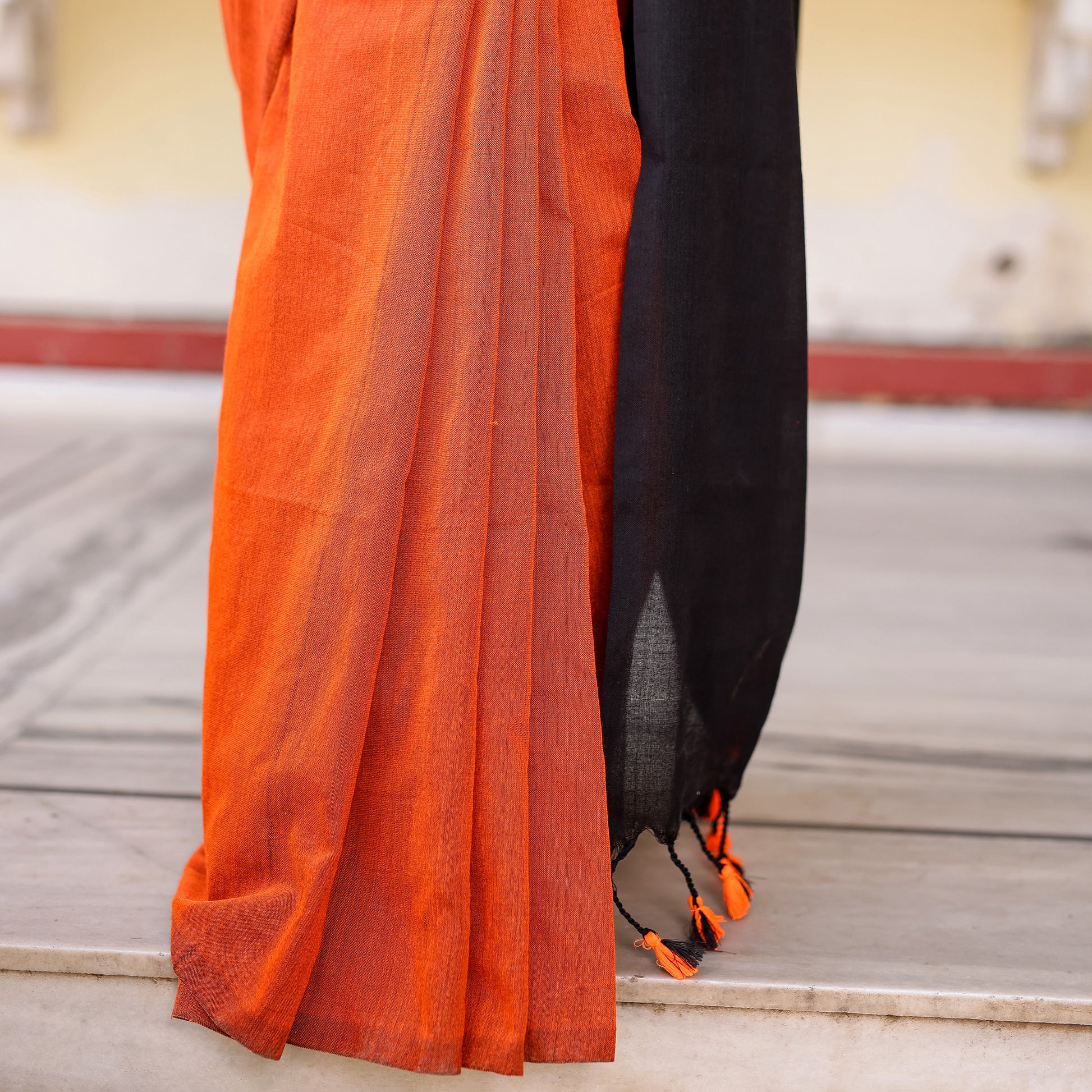 Agni draws its strength from warmth, earth, and resilience. Handwoven in khadi cotton, this saree features a bold burnt orange body anchored by a deep charcoal black pallu — a palette that speaks of grounded confidence and quiet power.