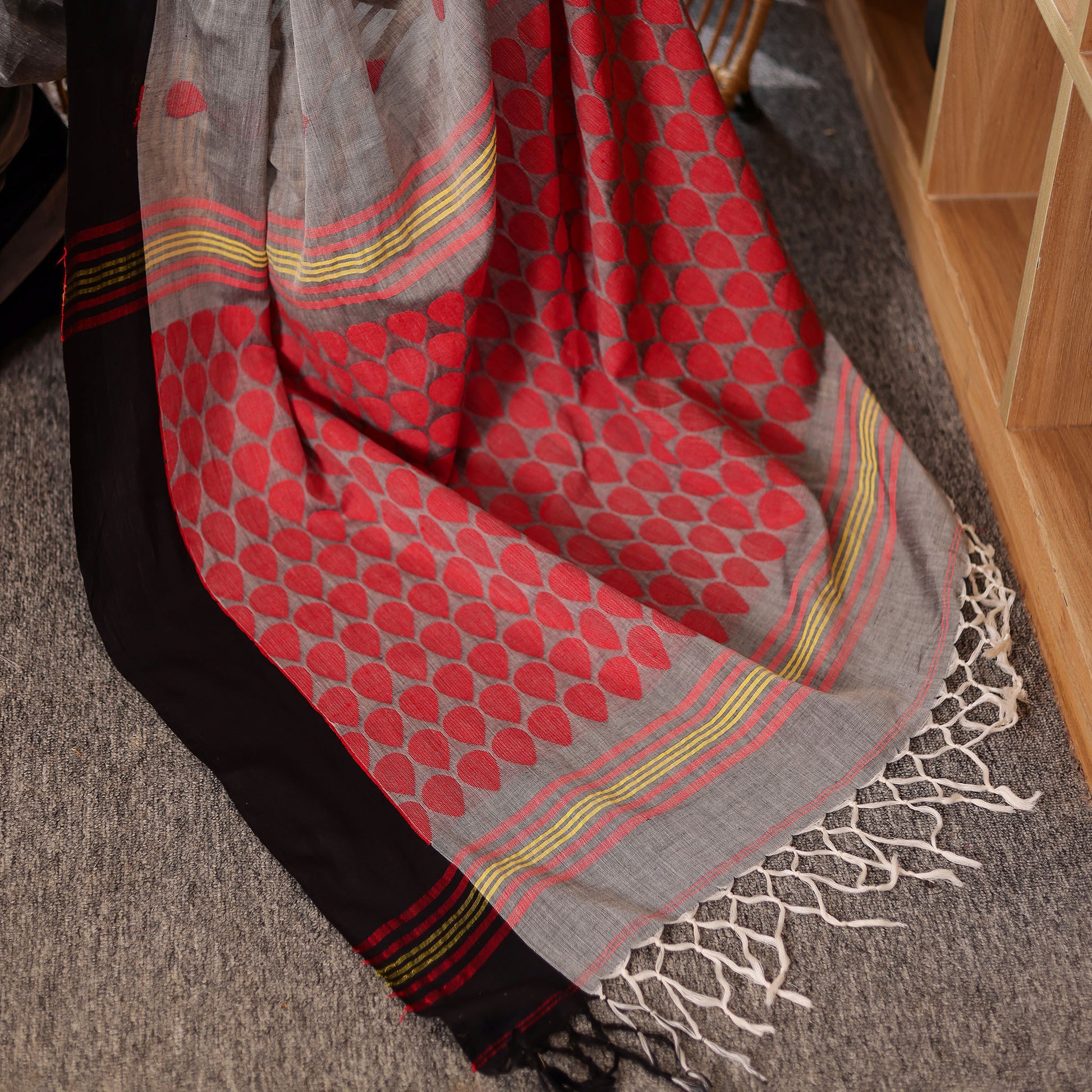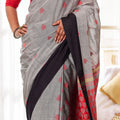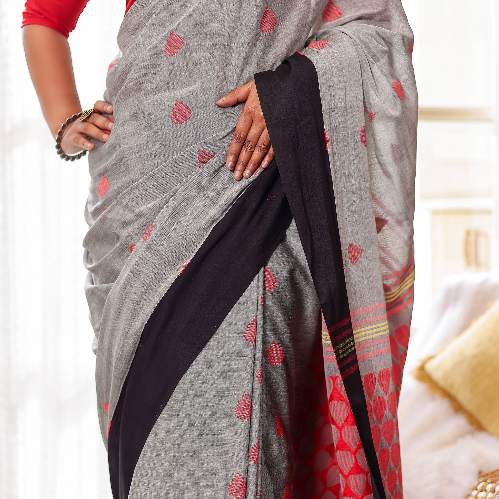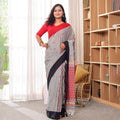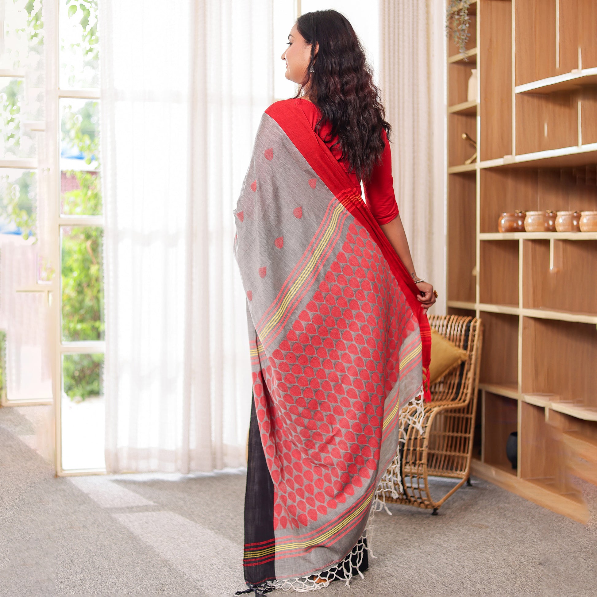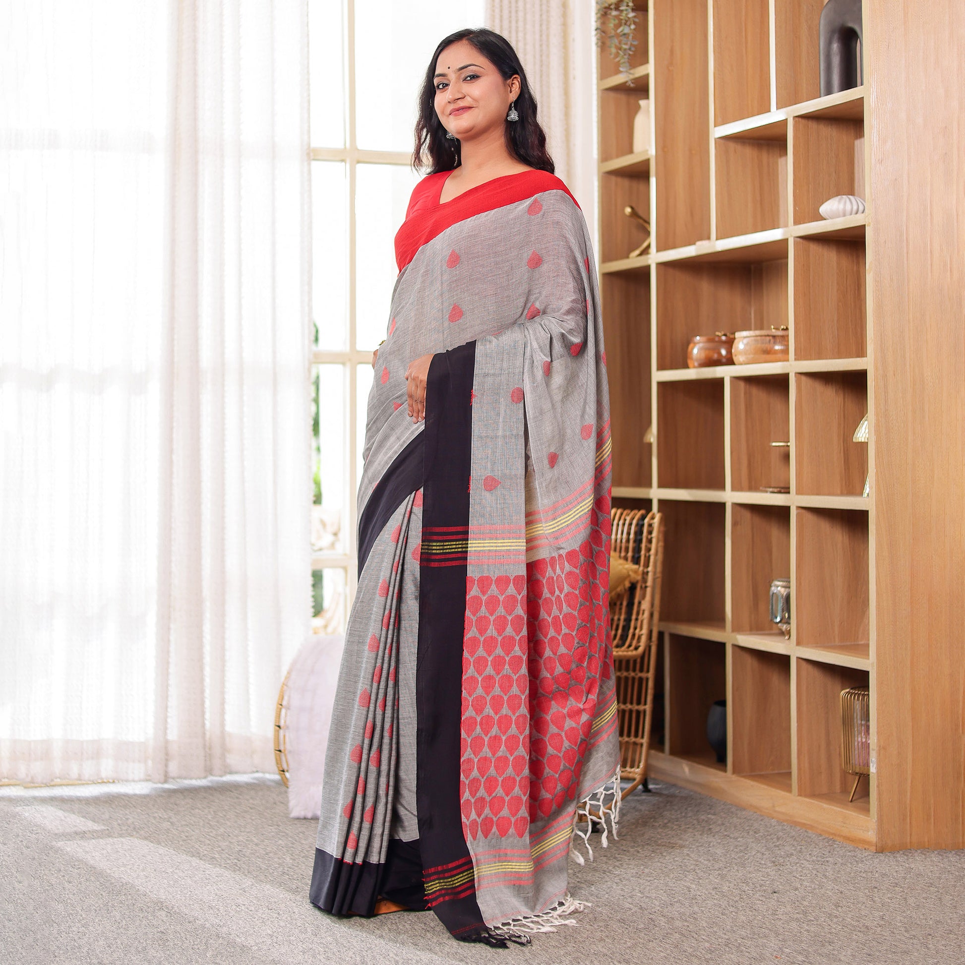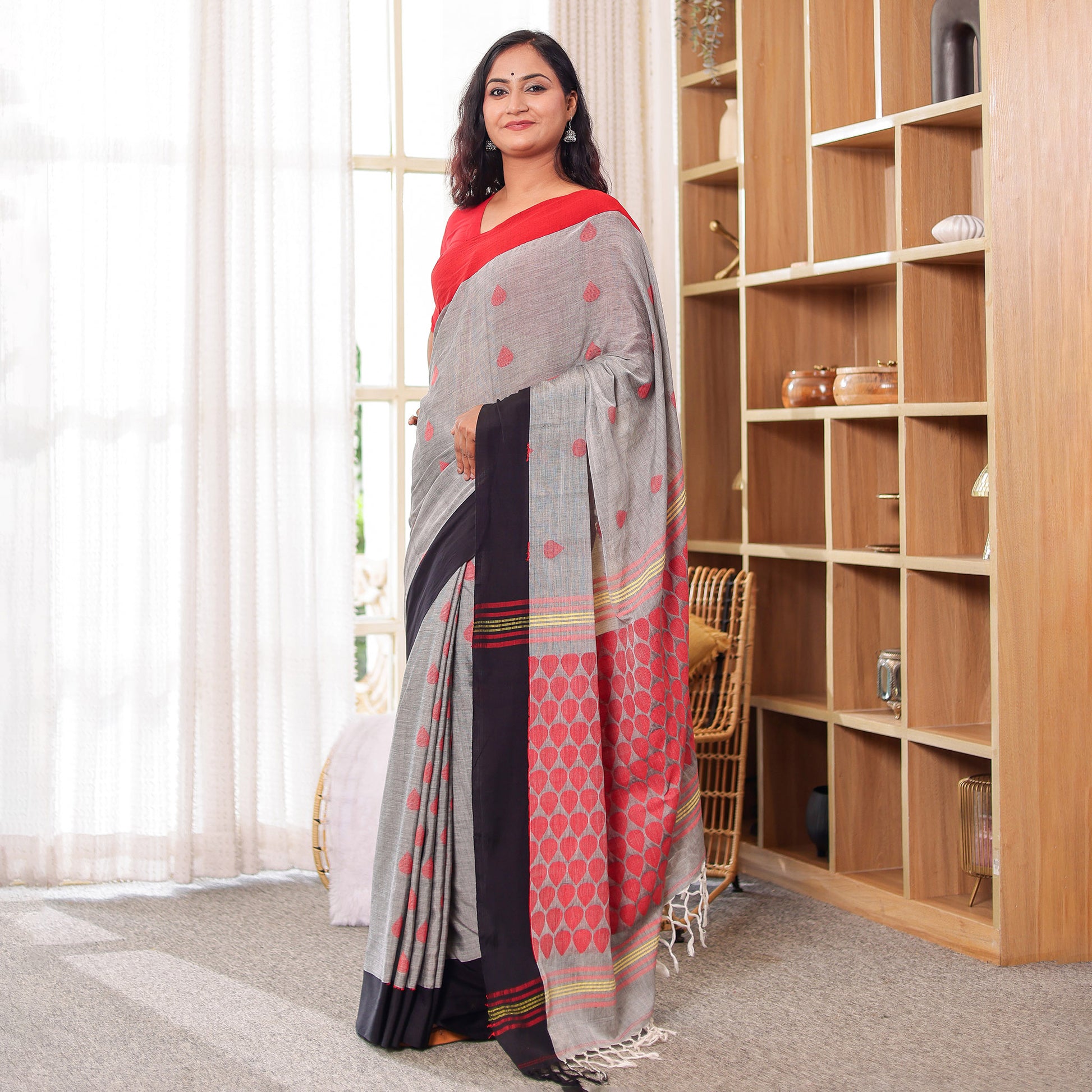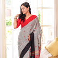 Dhara embodies balance — where strength meets grace. The grey body, punctuated with handwoven red motifs, contrasts beautifully against the black border and detailed red-striped pallu. Crafted in mercerized cotton, it’s airy, elegant, and versatile — perfect for workwear sophistication or subtle festive dressing.