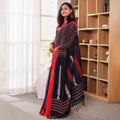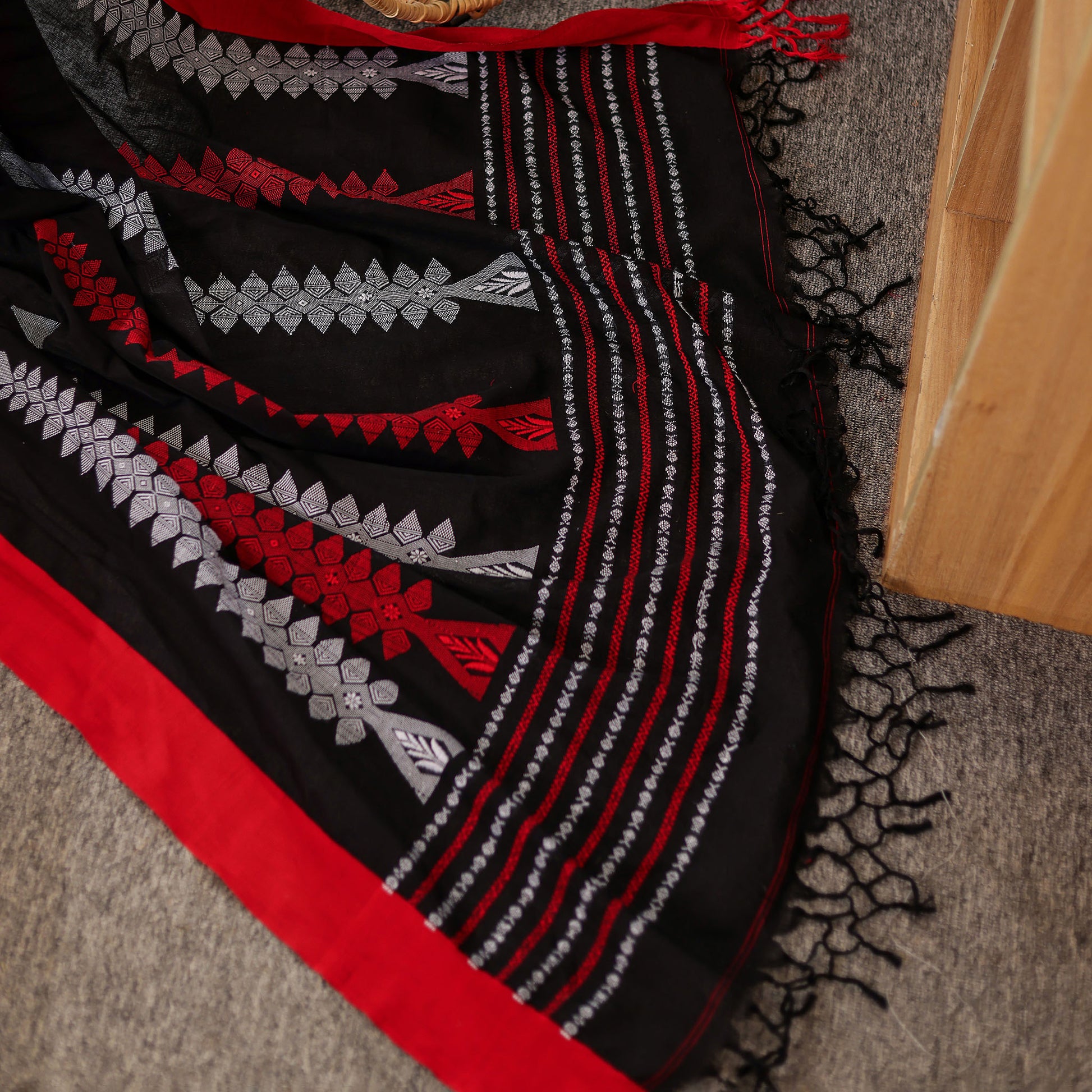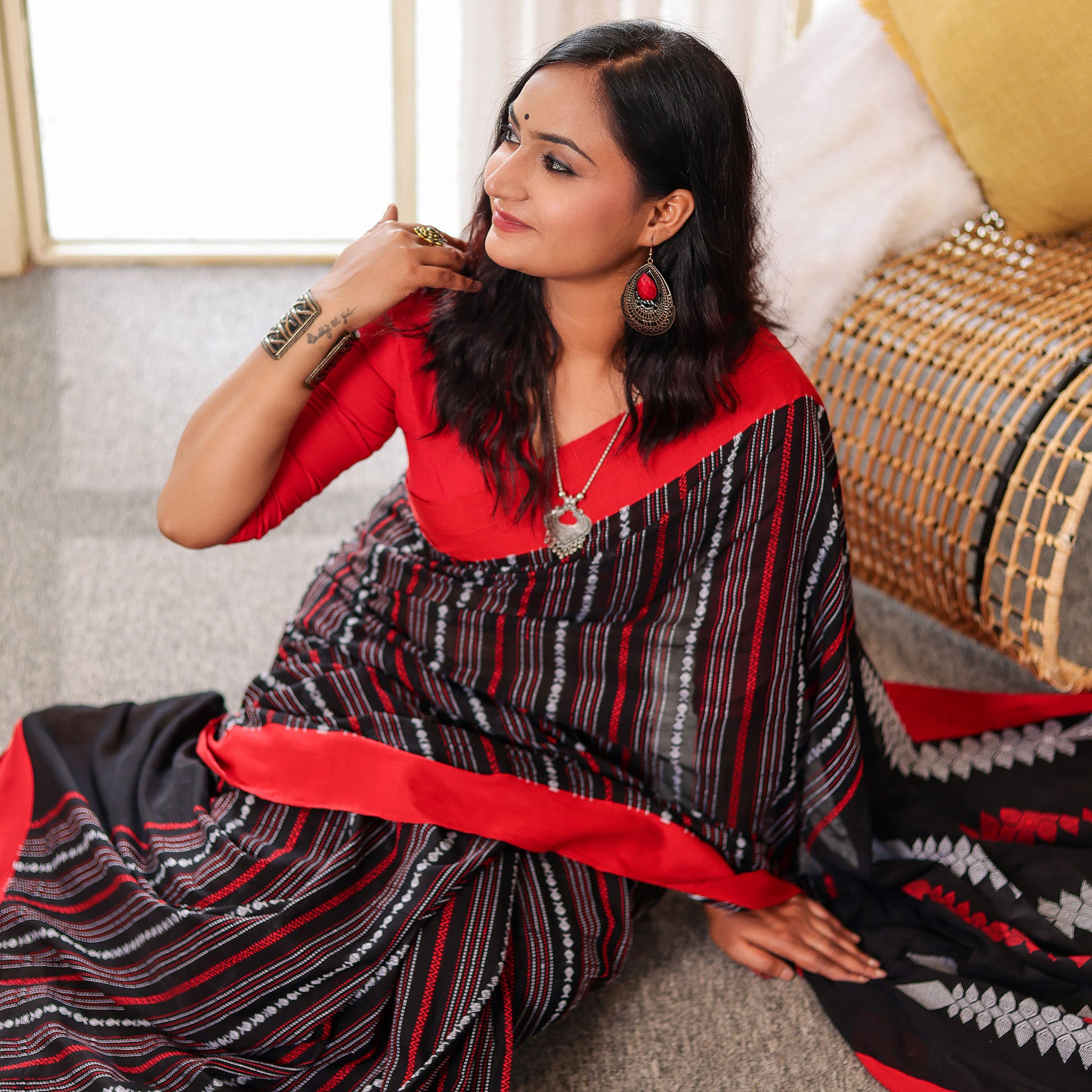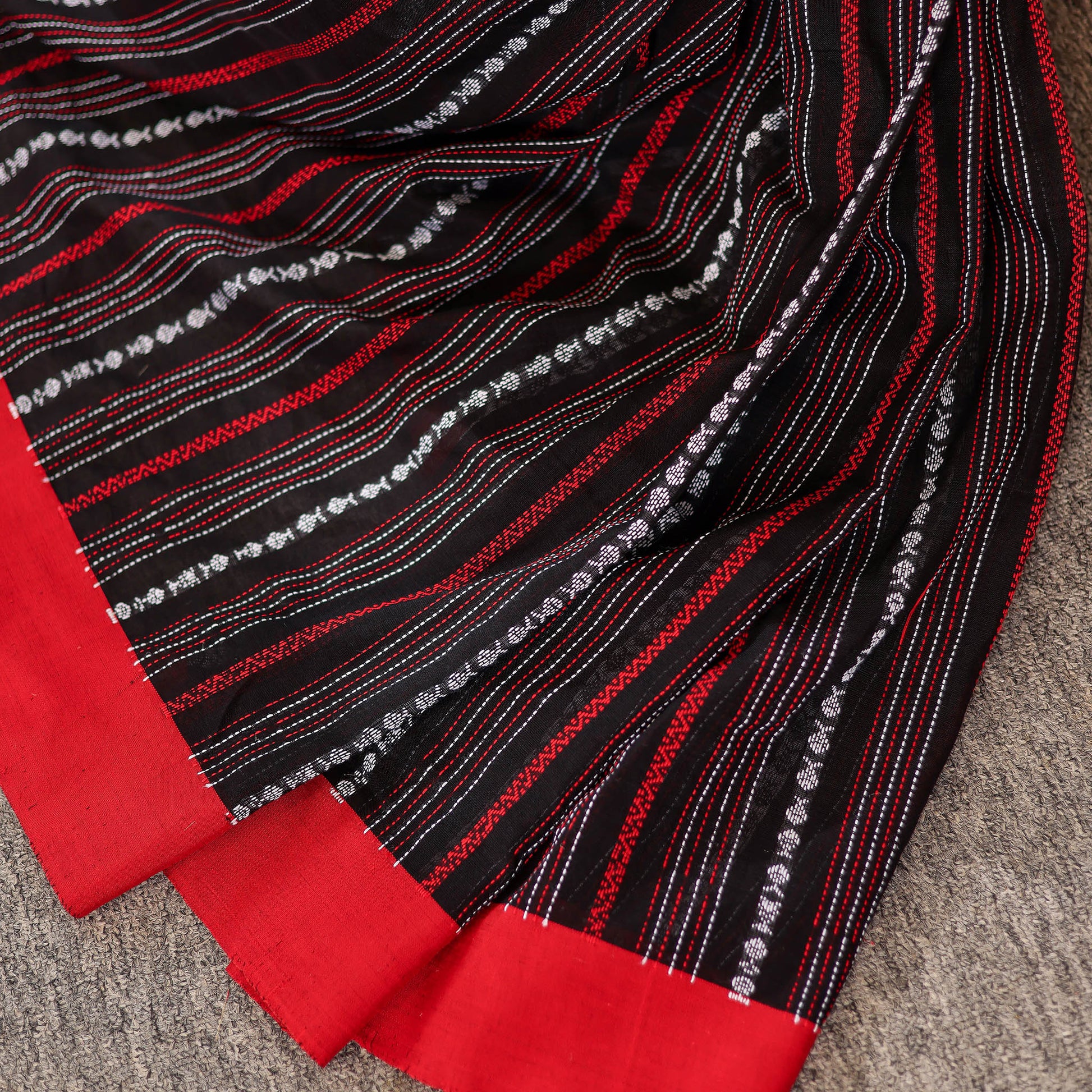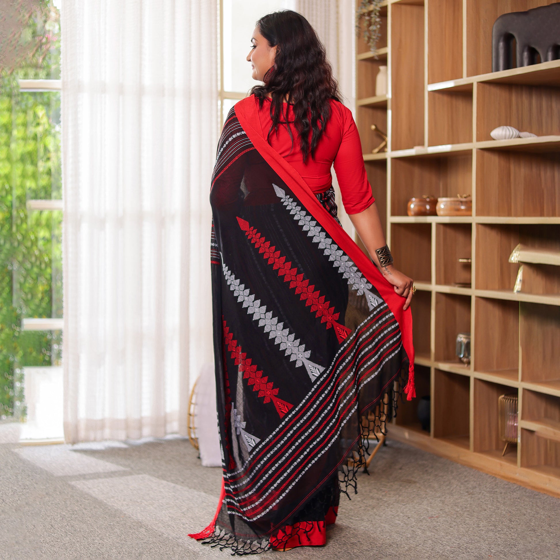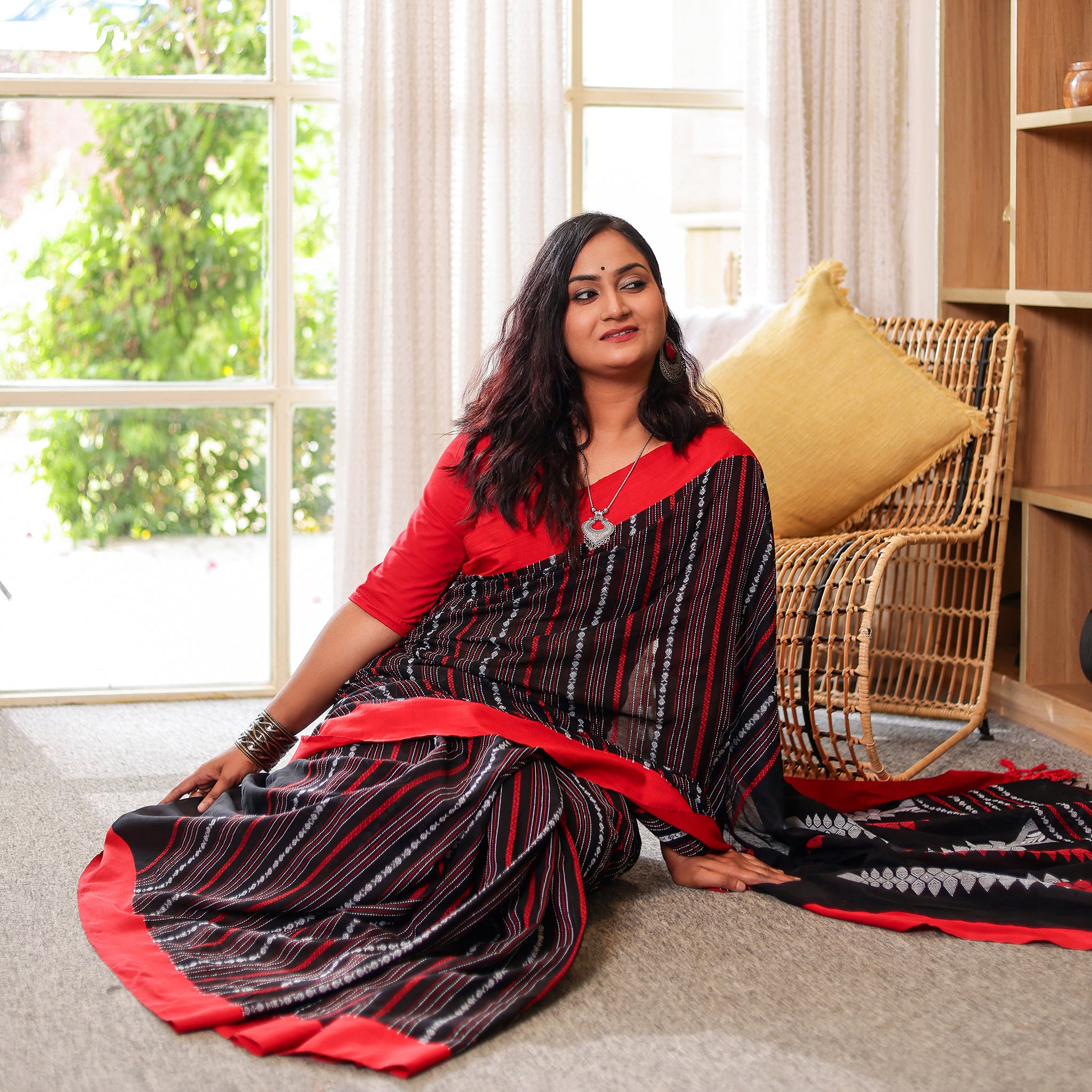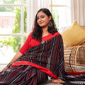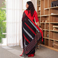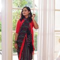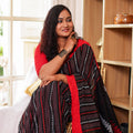 Kaashi is a striking blend of tradition and modern refinement. The deep black body carries a natural sheen, characteristic of mercerized cotton, giving it a rich and elevated finish. Bold red and silver handwoven accents add a dramatic yet elegant contrast, making it the perfect saree for festive nights, family celebrations, and cultural gatherings. With its crisp drape and premium feel, Kaashi brings effortless sophistication to every occasion.