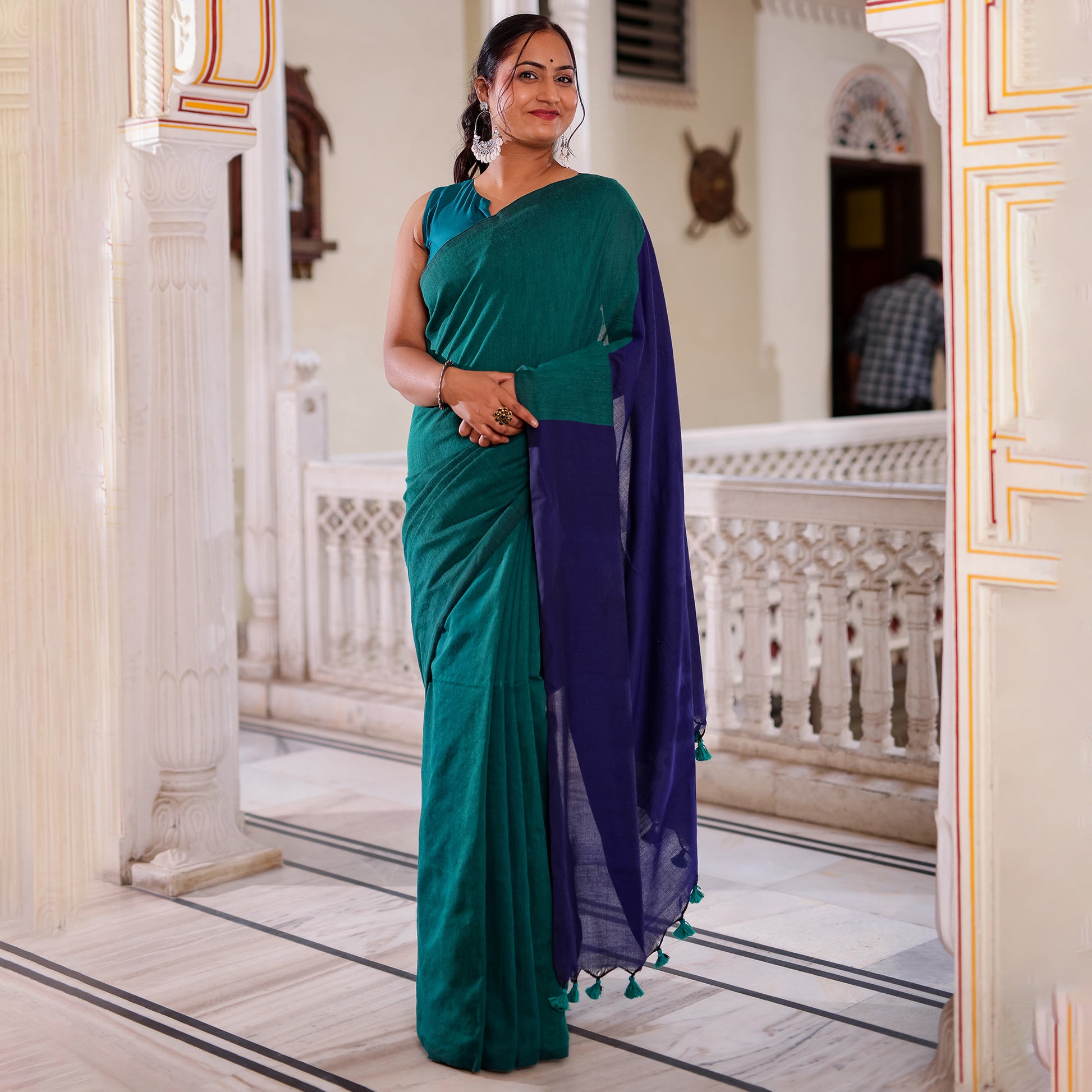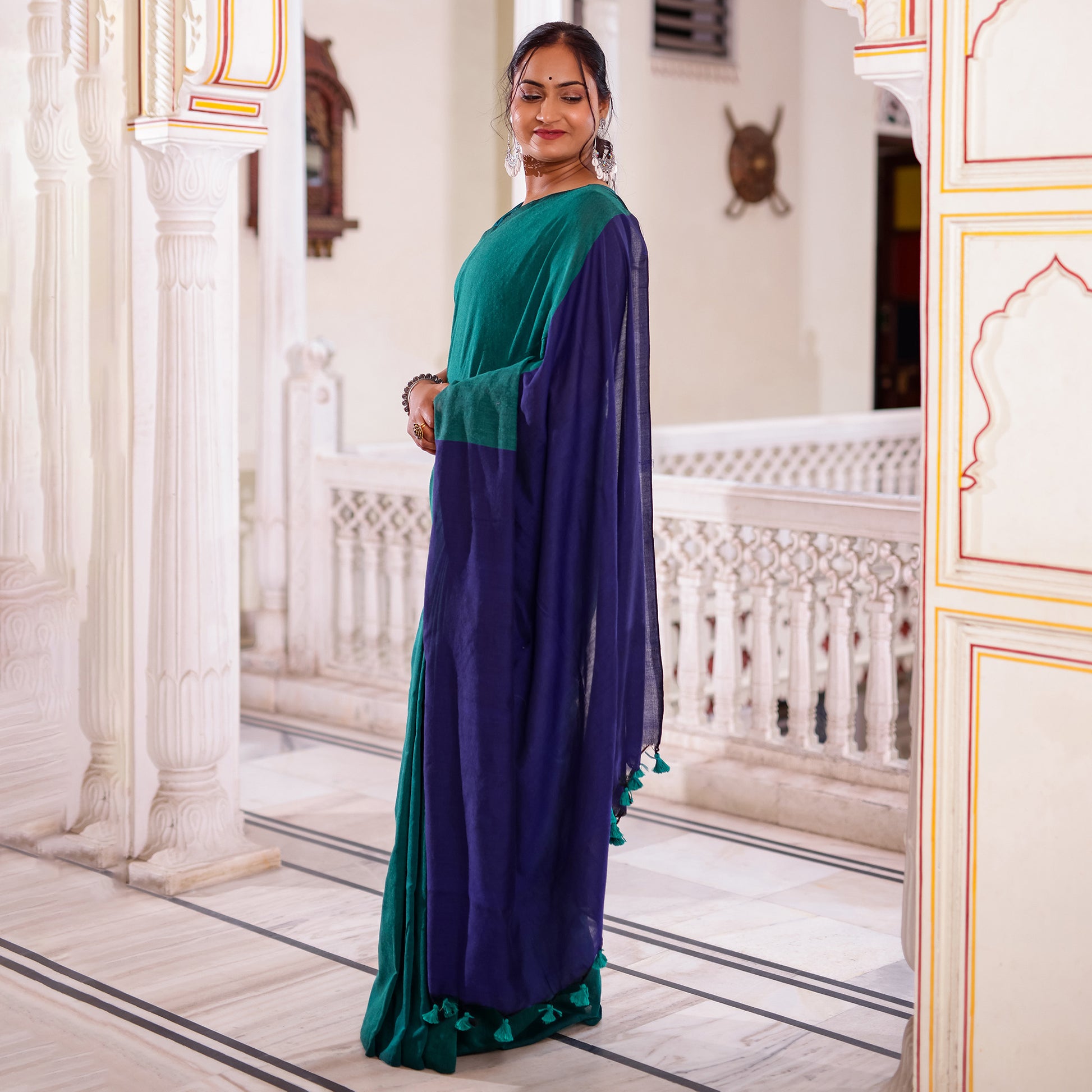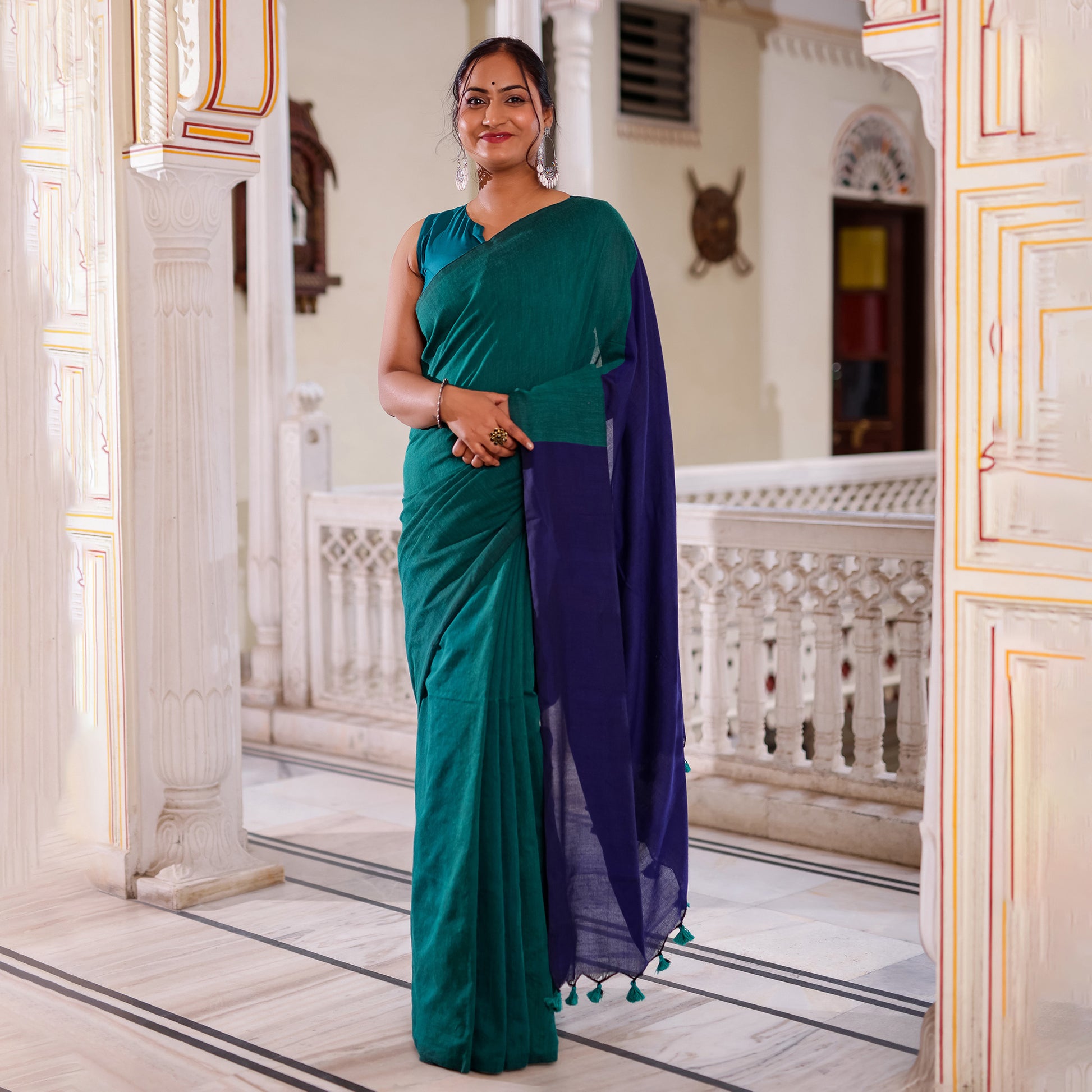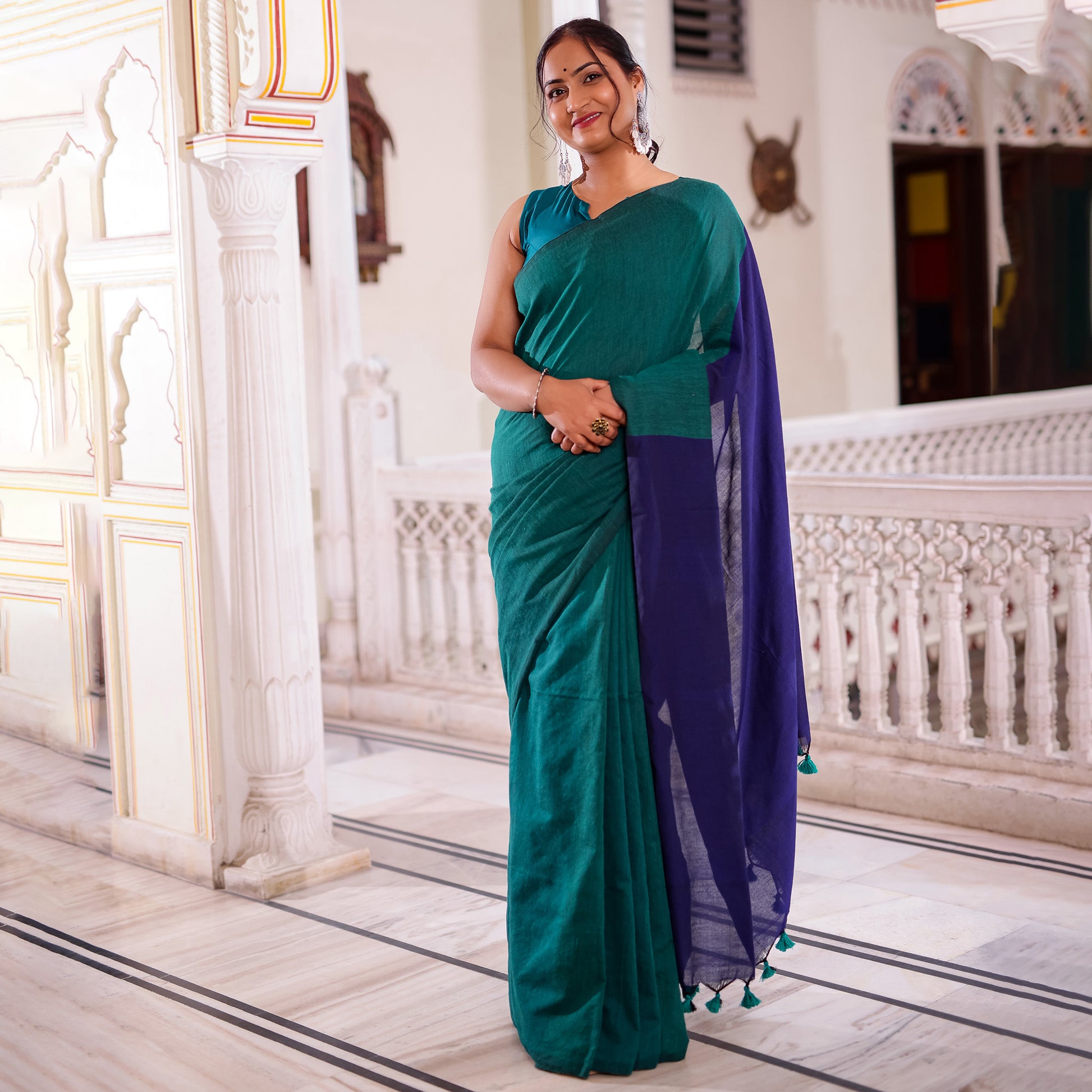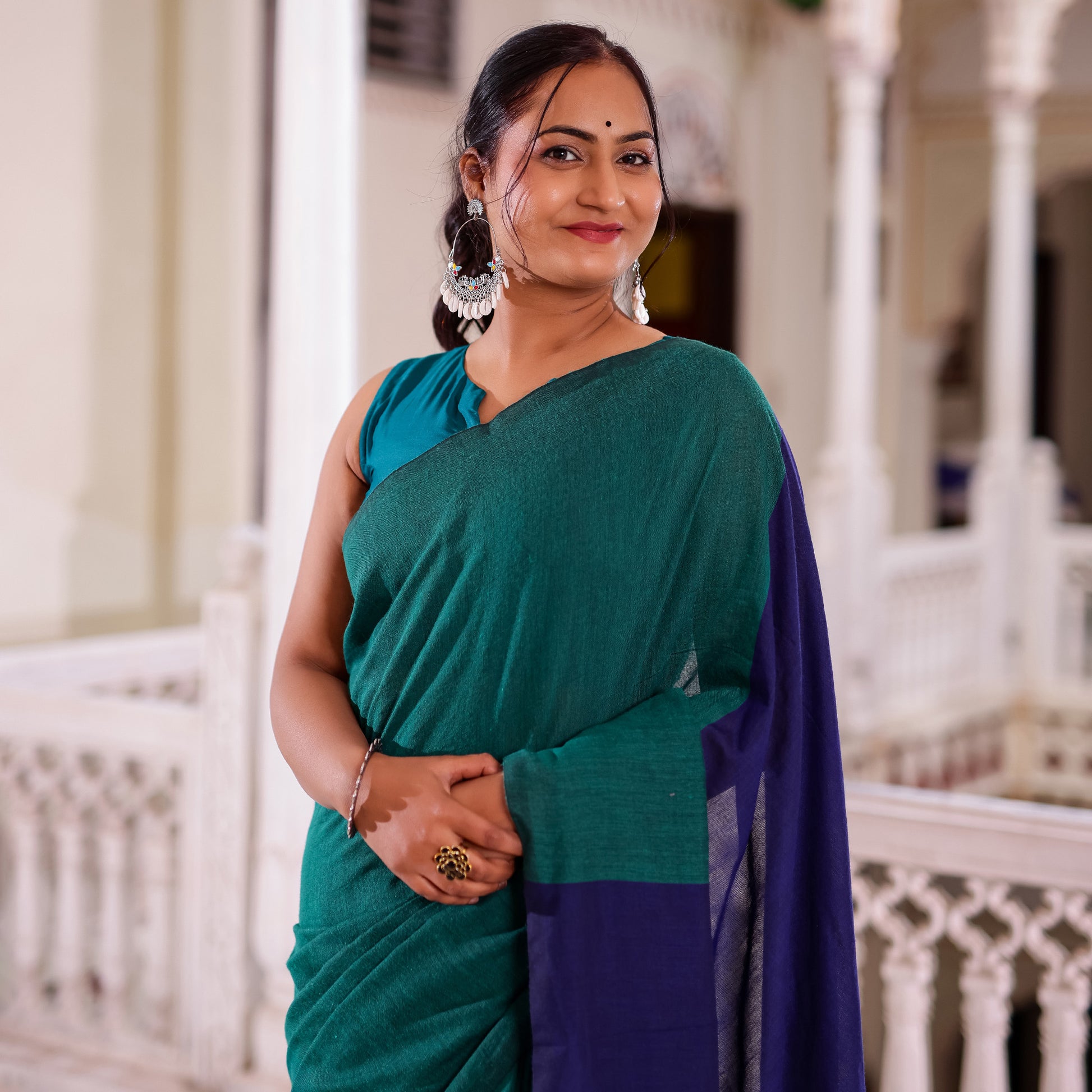 Nia reflects a quiet confidence rooted in simplicity. Handwoven in khadi cotton, this saree brings together a deep teal body and a striking indigo blue pallu — a pairing that feels composed, grounded, and timeless.