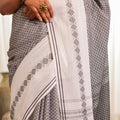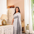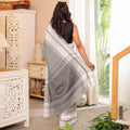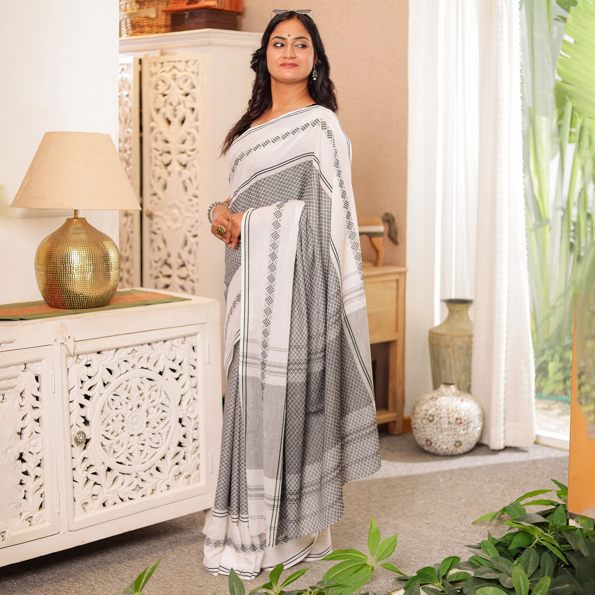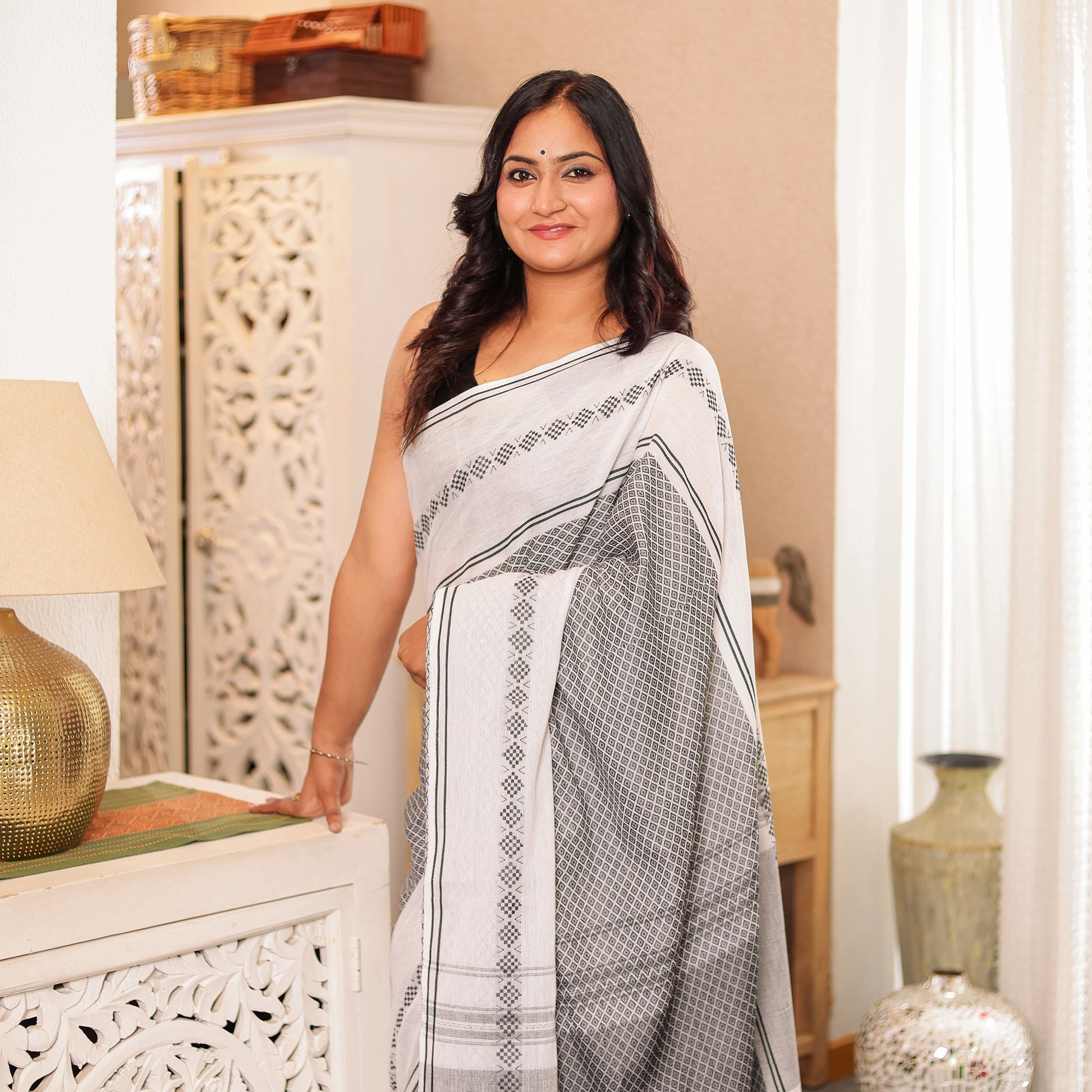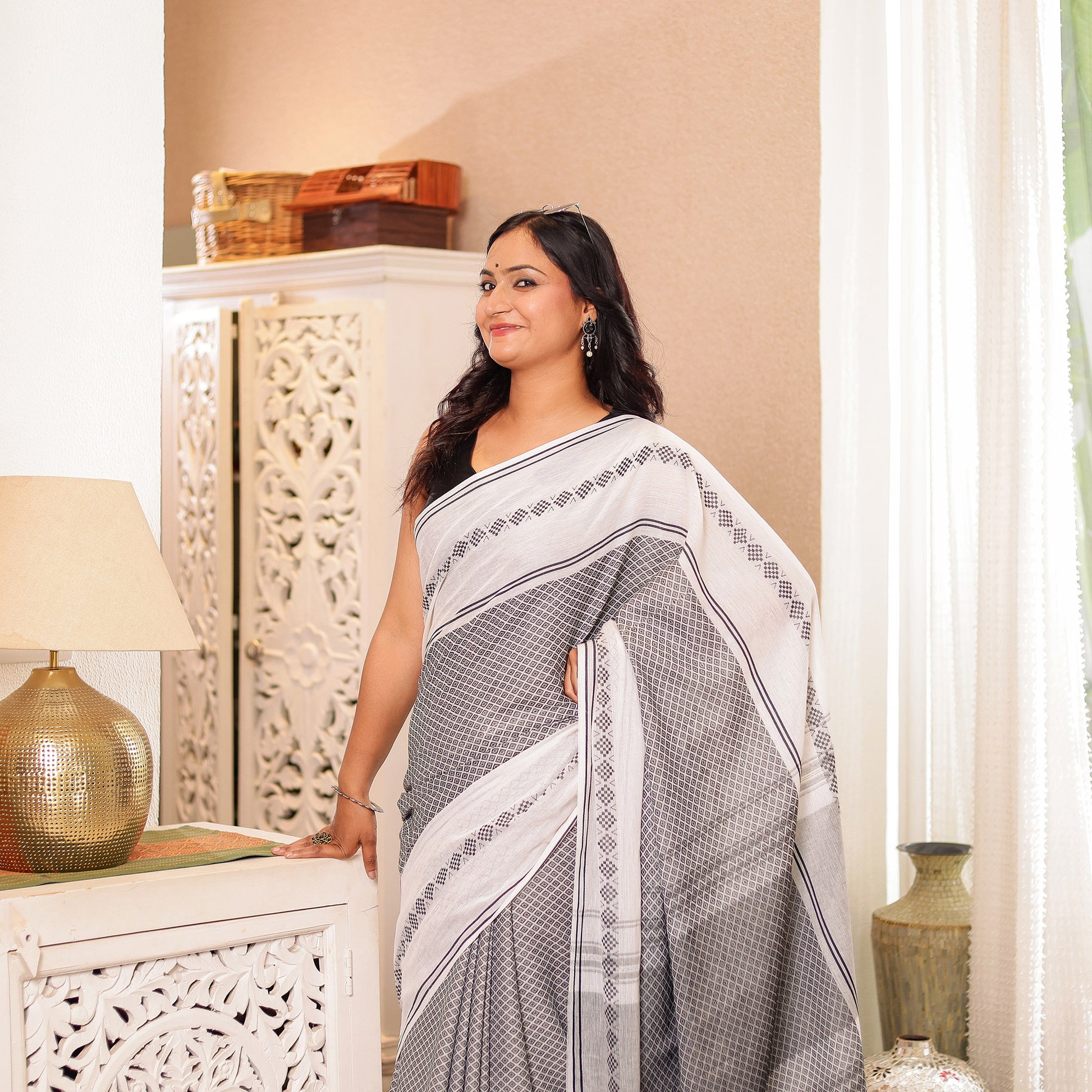 Nisha is a celebration of timeless monochrome beauty. Woven in pure khadi cotton, it carries a natural, earthy texture with unmatched breathability. The striking balance of black and white detailing gives this saree its modern yet grounded appeal, making it ideal for sophisticated work looks, intimate gatherings, or effortless everyday elegance. A versatile drape that speaks in style — softly, but powerfully.