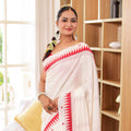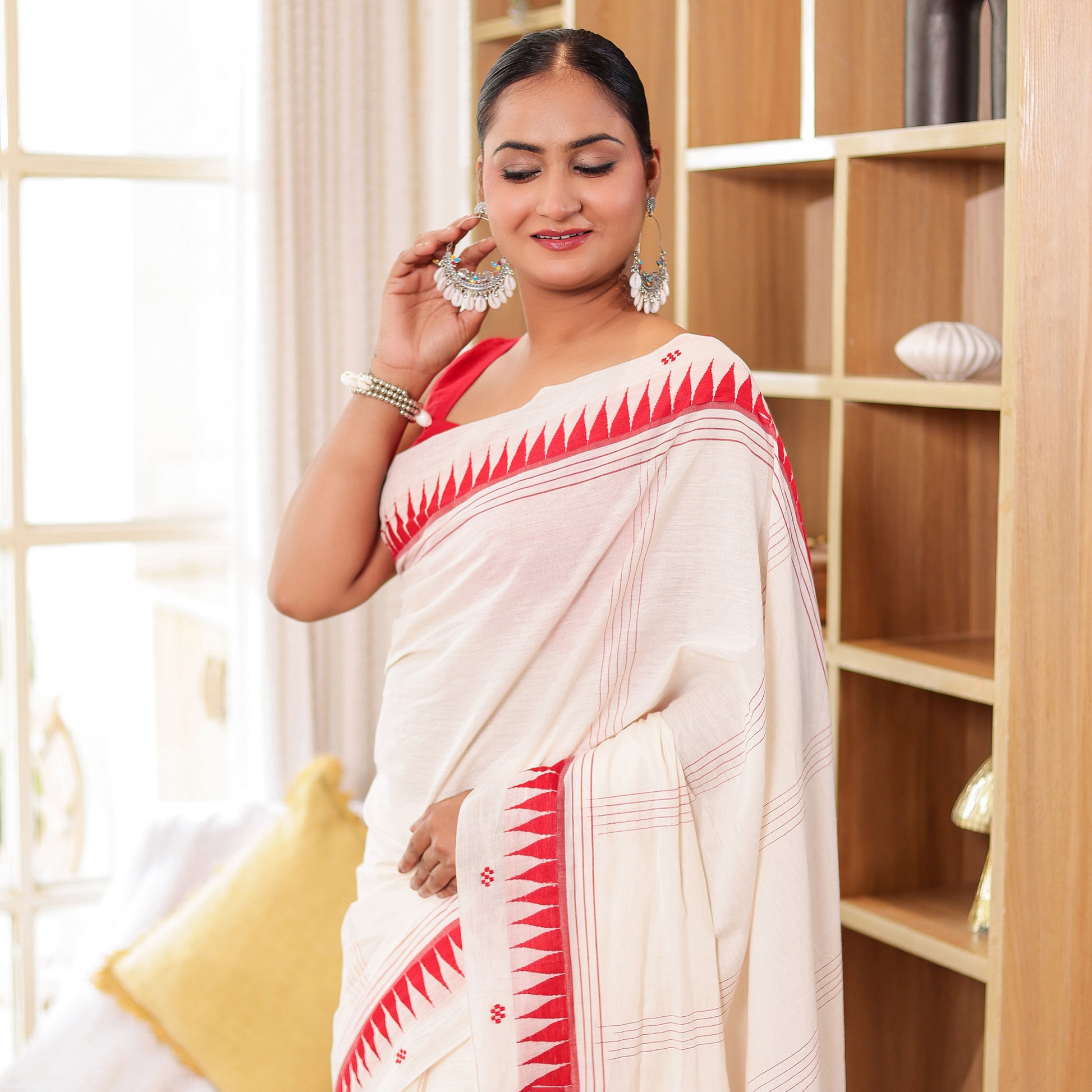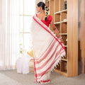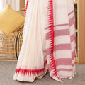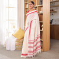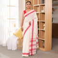 Raktima is a celebration of Indian handloom heritage — an ivory-white khadi cotton saree adorned with a rich crimson border that brings timeless contrast and sophistication. The handspun texture of khadi adds a natural elegance, making every drape feel grounded and authentic. Lightweight yet structured, Raktima is perfect for festivals, temple visits, cultural gatherings, or any moment that calls for dignified grace. The crimson border lends a touch of tradition without overpowering the serene ivory palette.