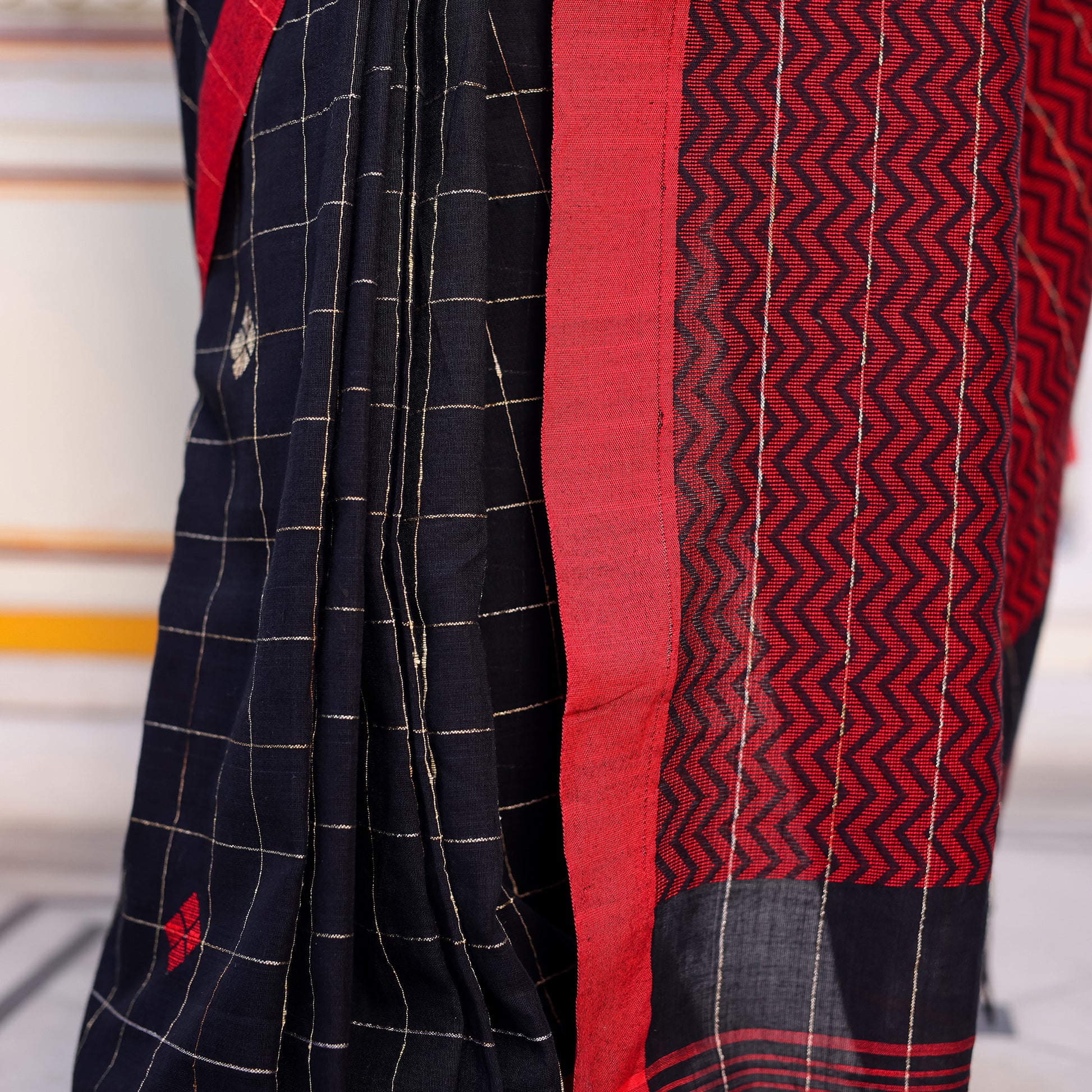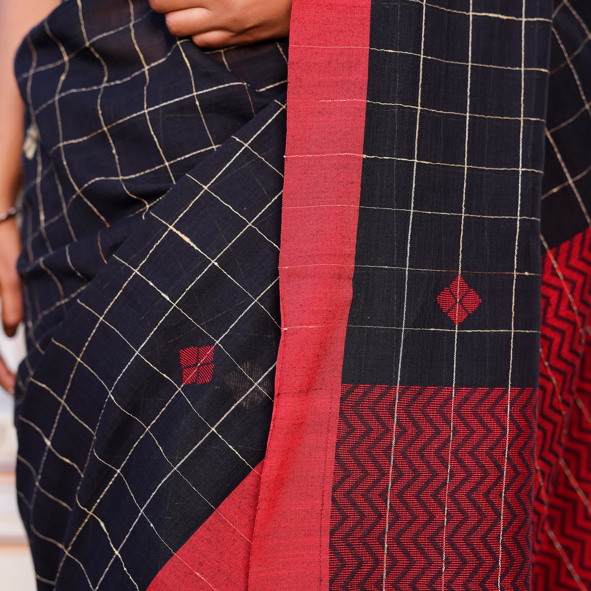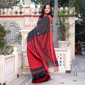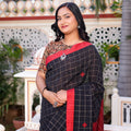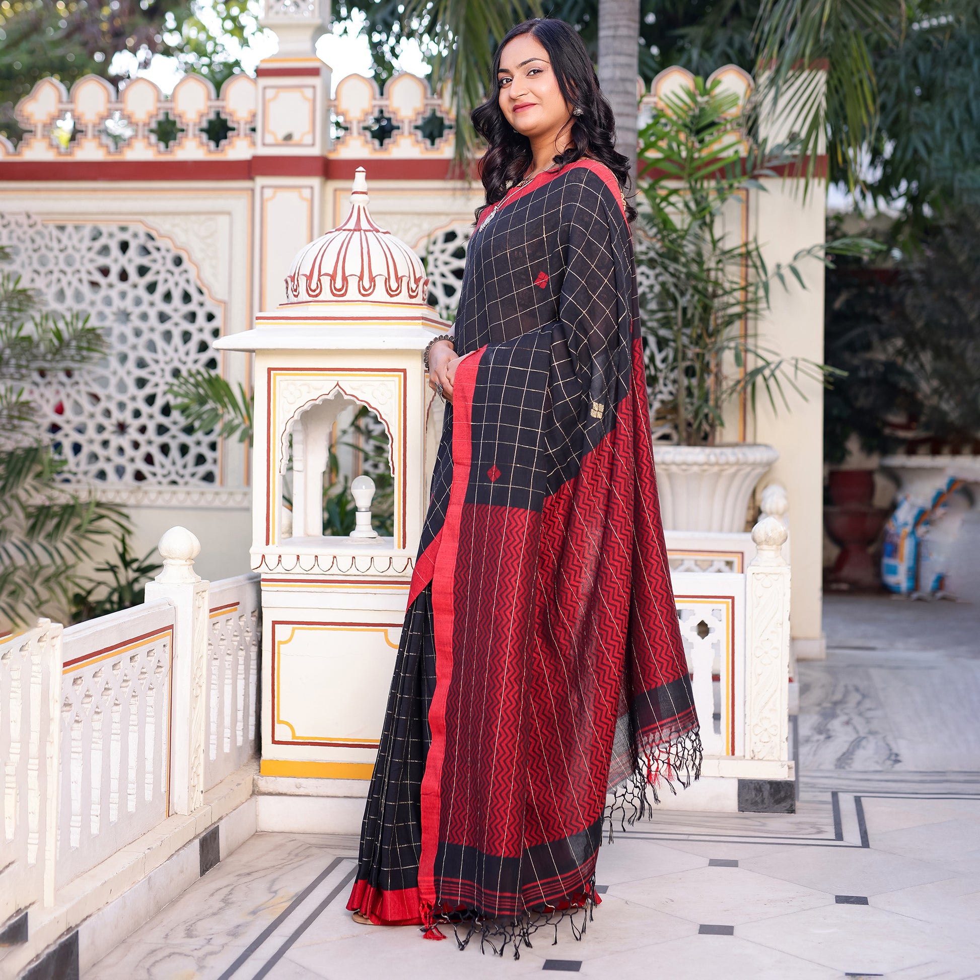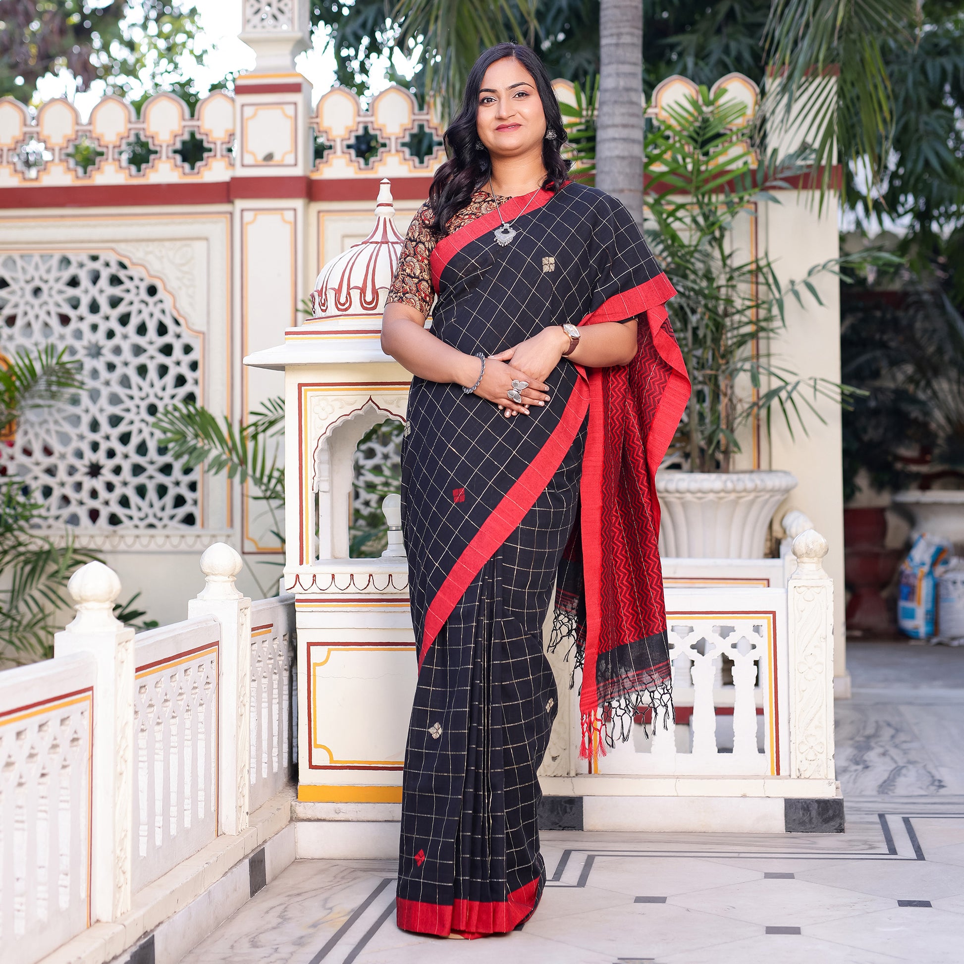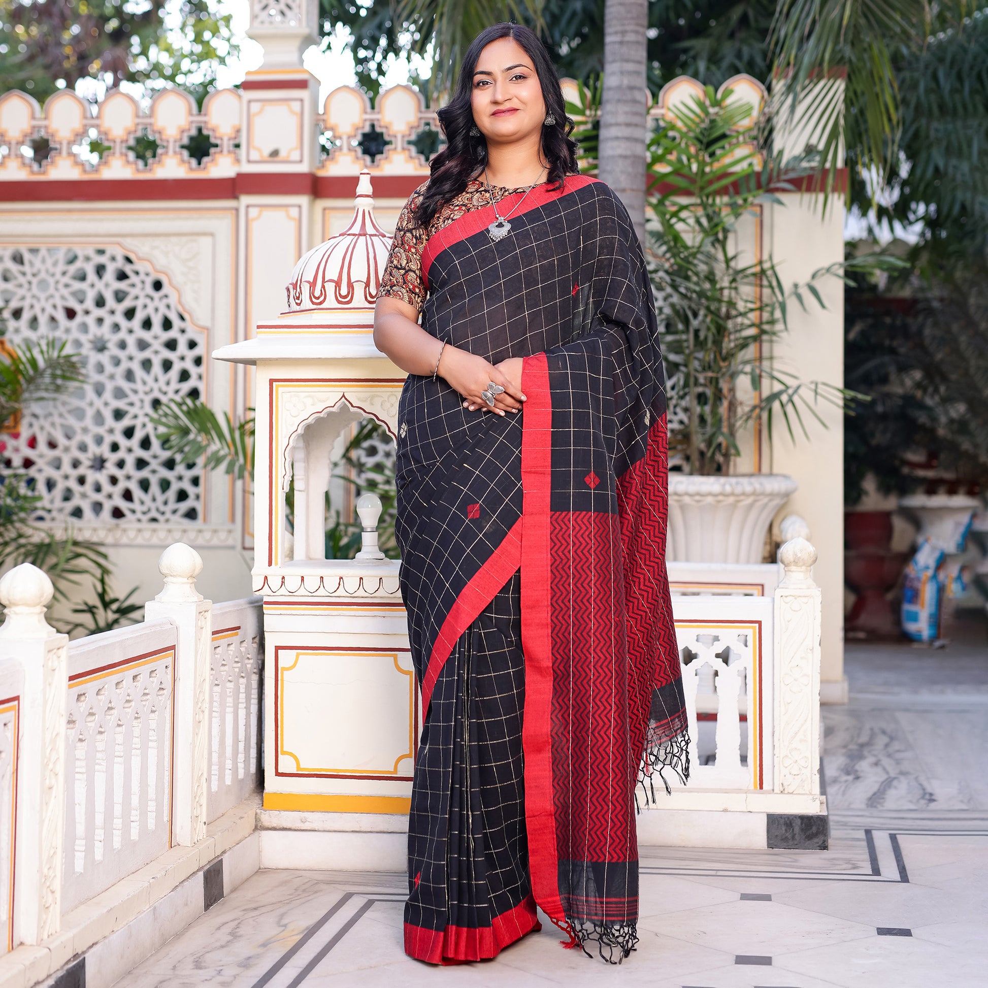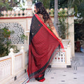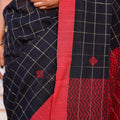 Riva draws its strength from contrast — deep black grounded in tradition, accented with a bold red border that speaks of confidence and cultural depth. Crafted in cotton, this saree is light, breathable, and made for long, effortless days.