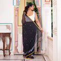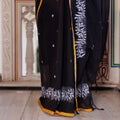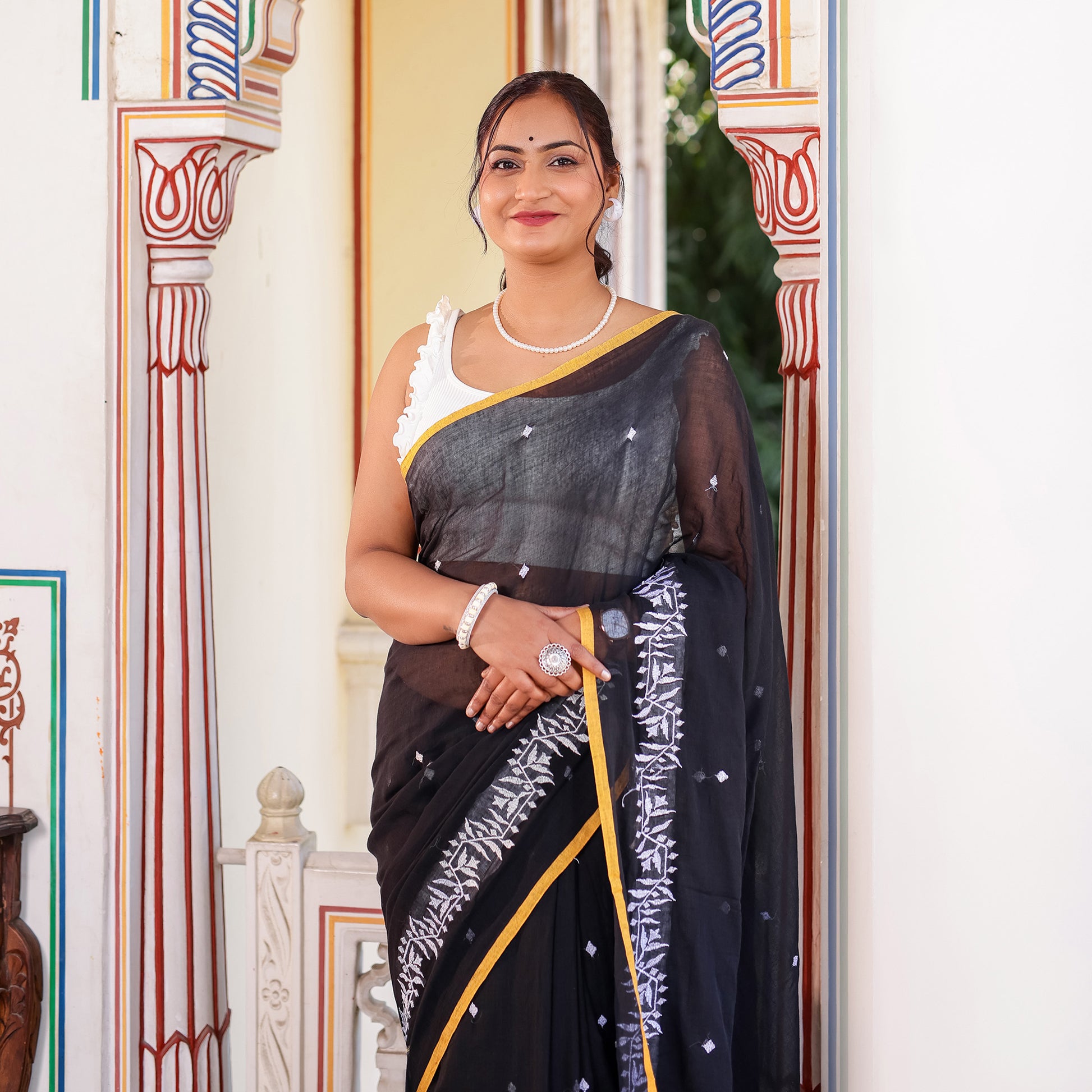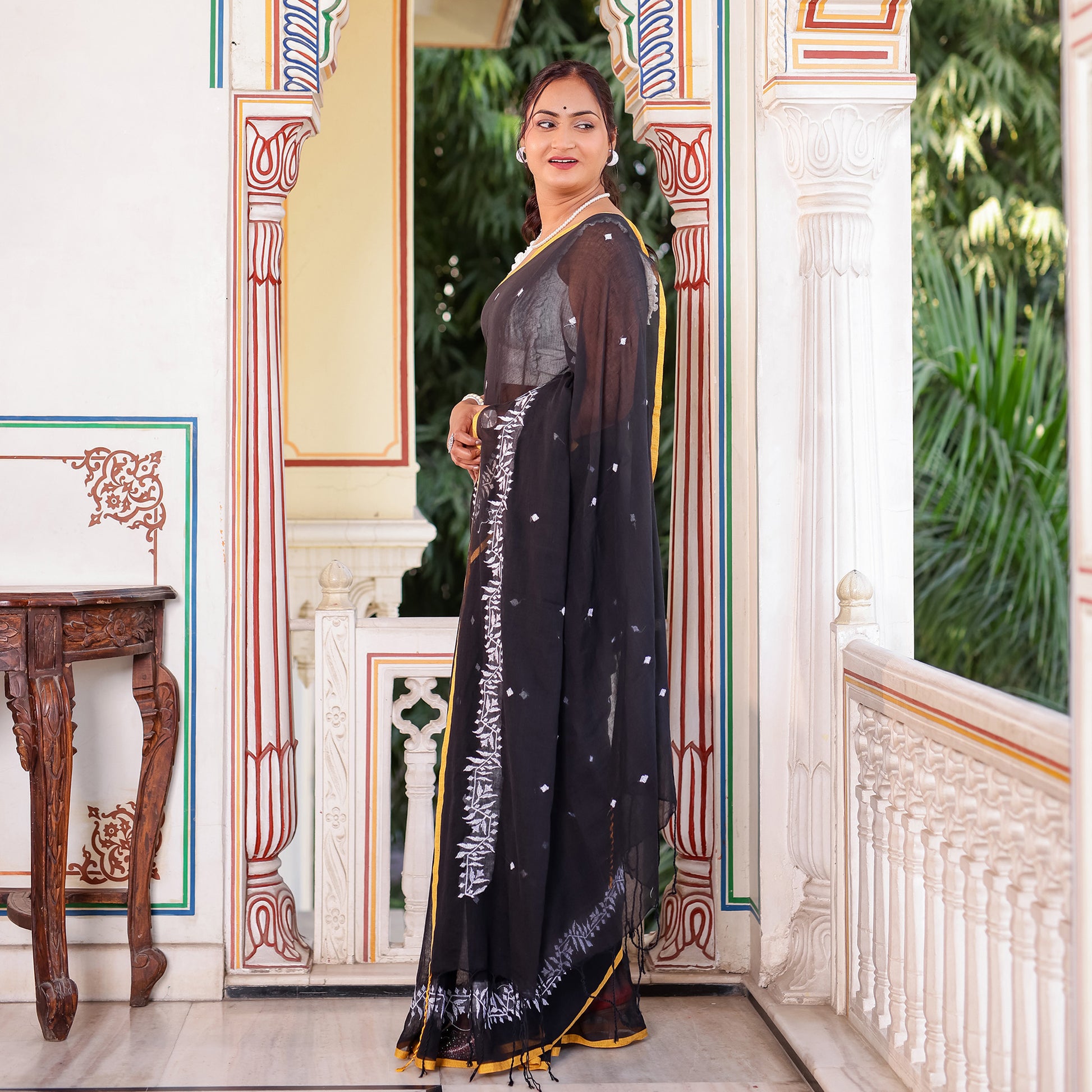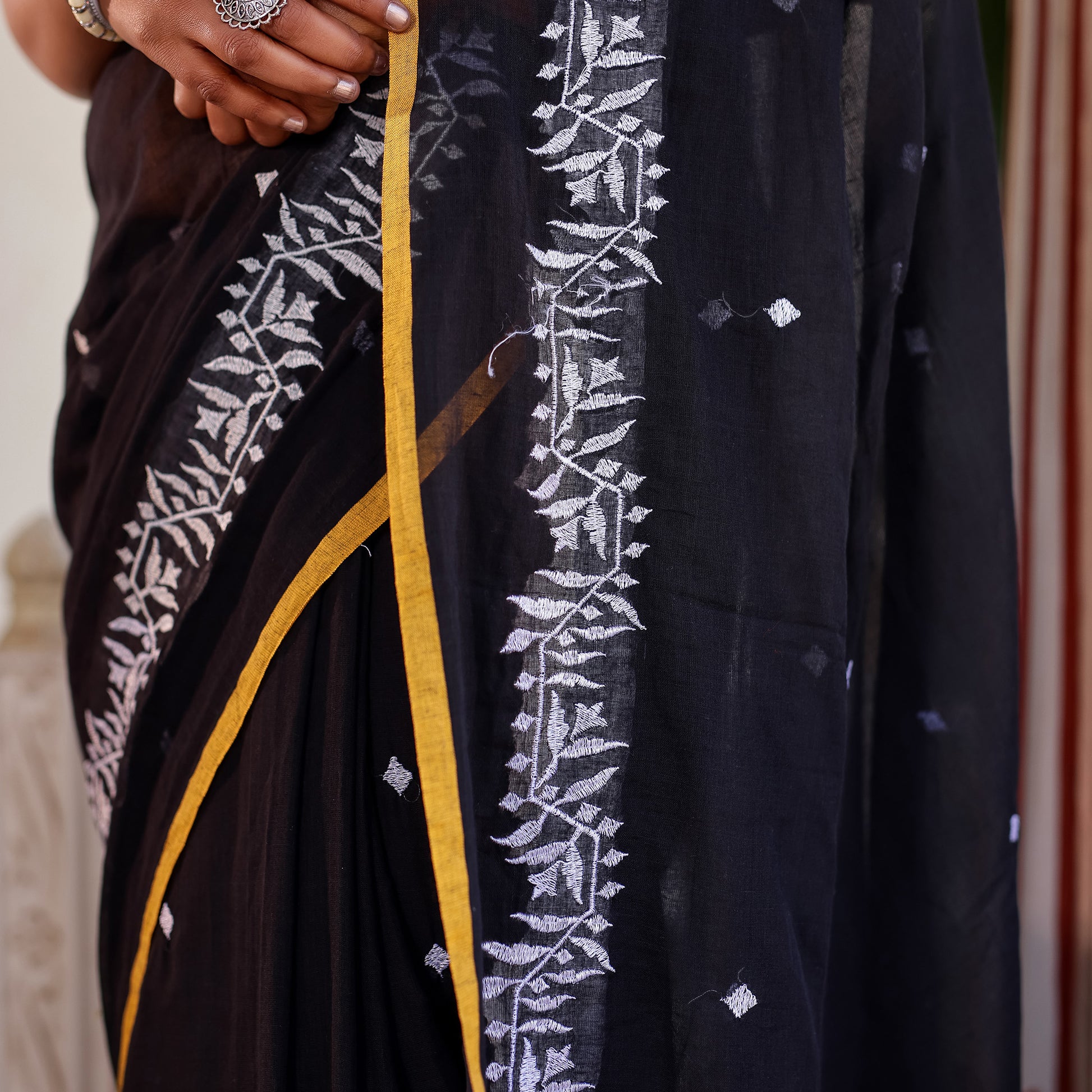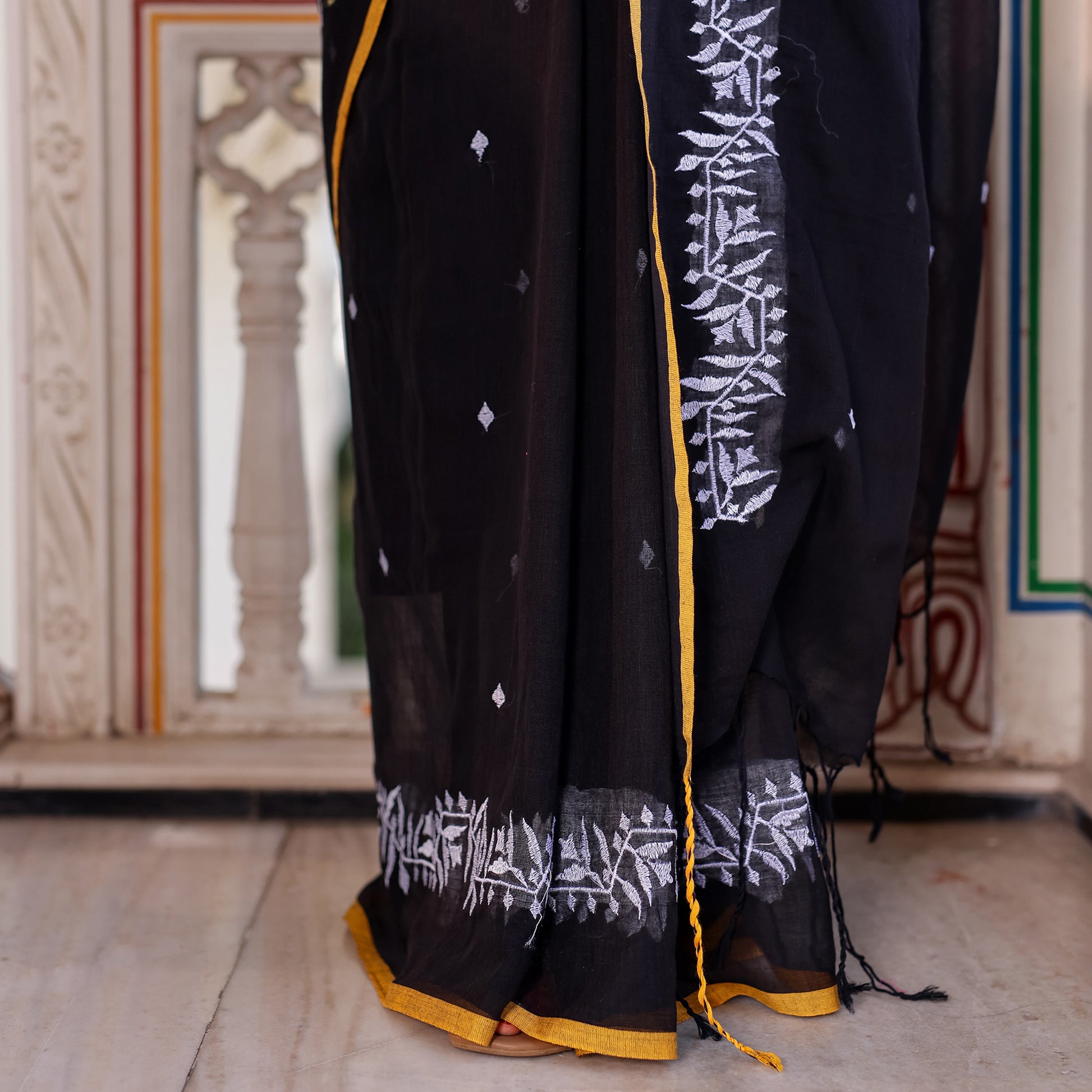 Vaani celebrates the beauty of restraint and detail. Crafted in cotton, this midnight black saree is elevated with delicate white embroidery that traces soft botanical patterns along the pallu and borders.